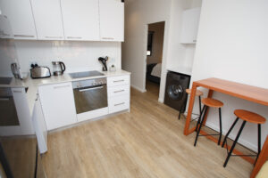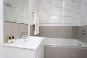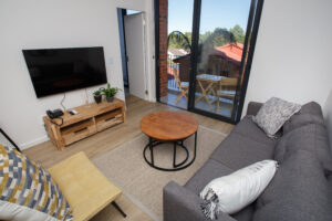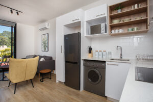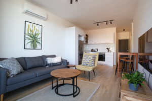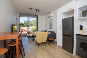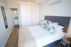 The air-conditioned apartment can accommodate up to 4 guests and contains 2 bedrooms, 2 bathrooms, and an open-plan kitchen and living area. The first bedroom contains a double bed and an en-suite bathroom with a shower only. This room has access to the balcony and has a view of the mountain. The second bedroom contains a double bed. The second bathroom contains a bath and shower combo.
