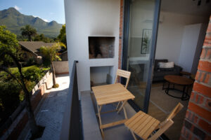 The kitchen is fully equipped with a fridge-freezer, stove and oven, microwave, kettle, toaster, and a washing machine. There is a dining counter with stools. The lounge offers comfortable seating and a flat-screen TV. The living area opens to a balcony with outdoor furniture and a built-in braai.